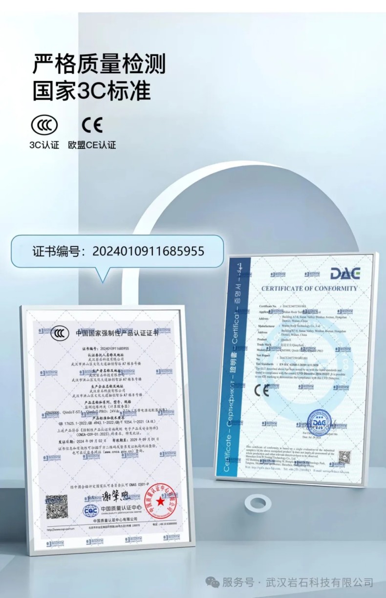 2024年9月,武汉海洋之神HY590科技有限公司自研主要产品,QM5000监测边缘网关,通过了国家强制性产品认证制度以及欧盟强制性安全合格标志,取得了自研主要产品的安全性和合规性。